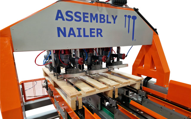 La Chiodatrice ASSEMBLY NAILER è una macchina automatica per completare la costruzione di pallets a 4 vie, in automatico unisce tramite chiodatura le gambe (Leg) e i piani (Deck) precedentemente costruiti.